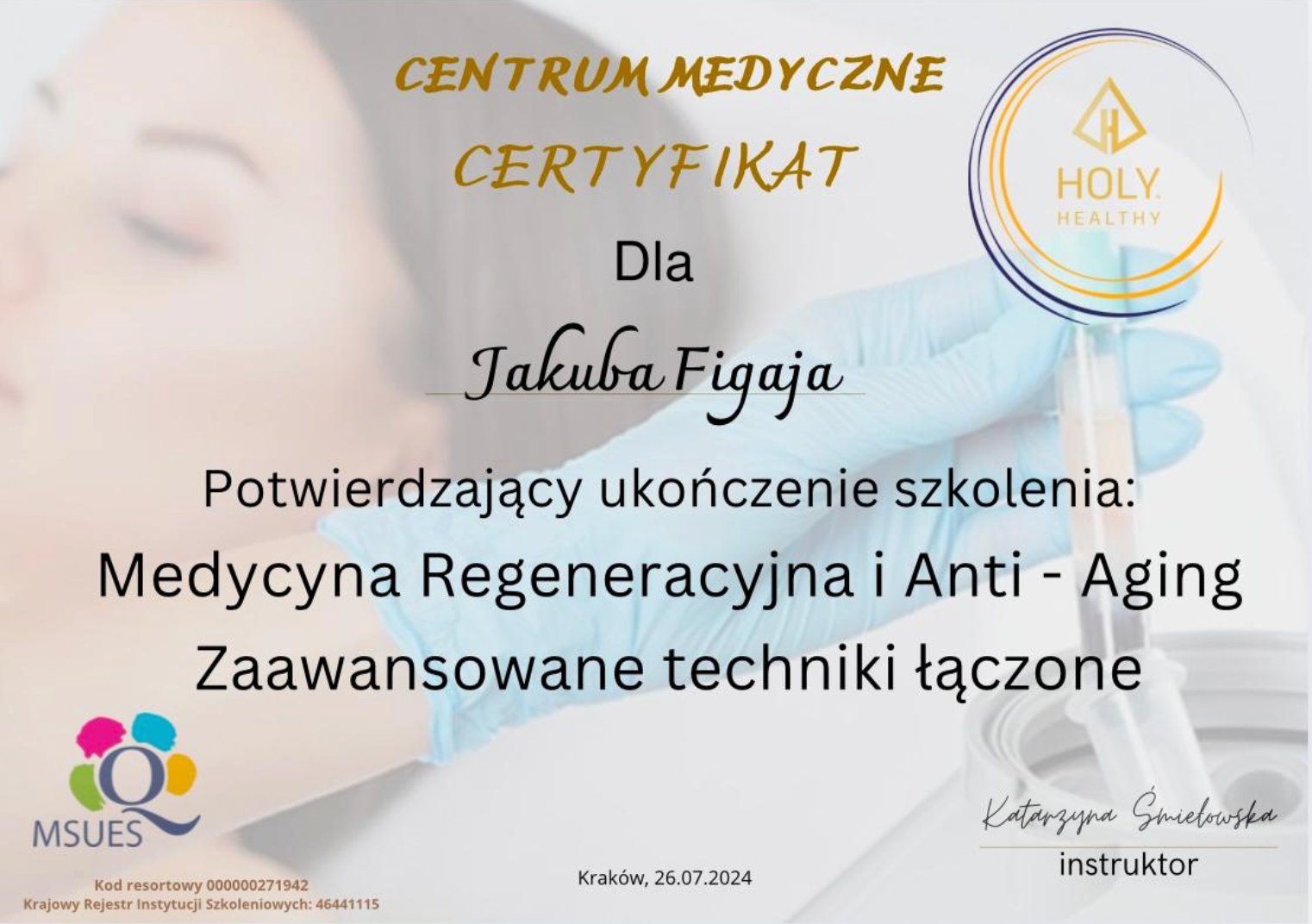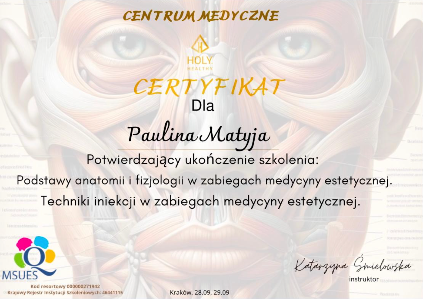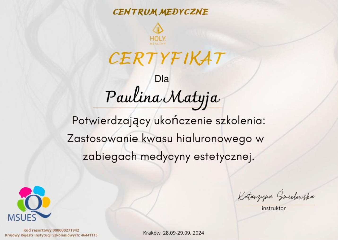 Po ukończeniu każdego szkolenia otrzymasz certyfikat potwierdzający zdobyte umiejętności, uznawany w branży medycyny estetycznej.