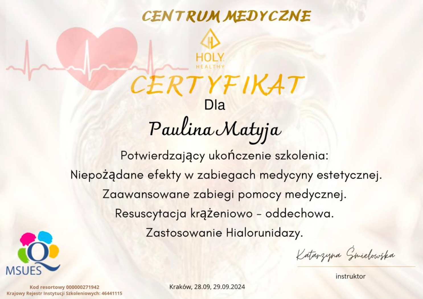 Każde szkolenie prowadzone jest przez doświadczonych specjalistów z odpowiednimi kwalifikacjami, w tym wpisem do rejestru Krajowego Systemu Informacji o Szkoleniach (KRIS) oraz certyfikatem Ministerstwa Sprawiedliwości Unii Europejskiej (MSUES). Jesteśmy również podmiotem leczniczym, co pozwala nam na organizację specjalistycznych kursów dla profesjonalistów z branży medycznej.